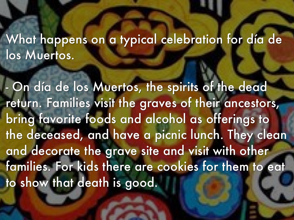 - On día de los Muertos, the spirits of the dead return. Families visit the graves of their ancestors, bring favorite foods and alcohol as offerings to the deceased, and have a picnic lunch. They clean and decorate the grave site and visit with other families. For kids there are cookies for them to eat to show that death is good.