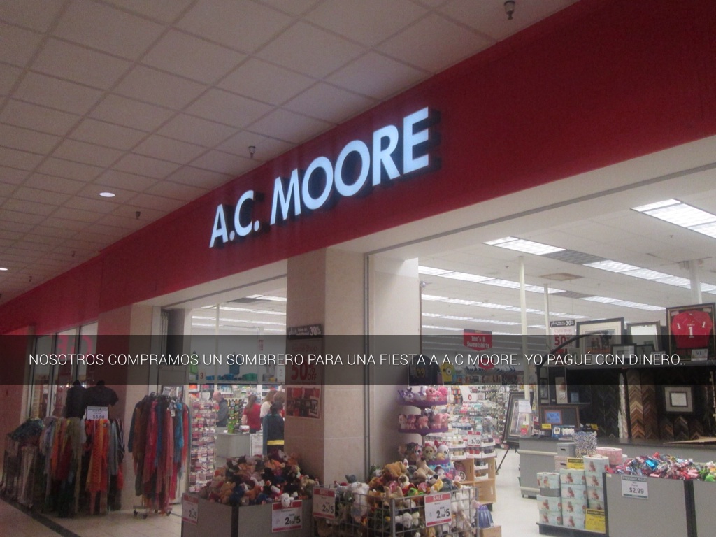 NOSOTROS COMPRAMOS UN SOMBRERO PARA UNA FIESTA A A.C MOORE. YO PAGUÉ CON DINERO..