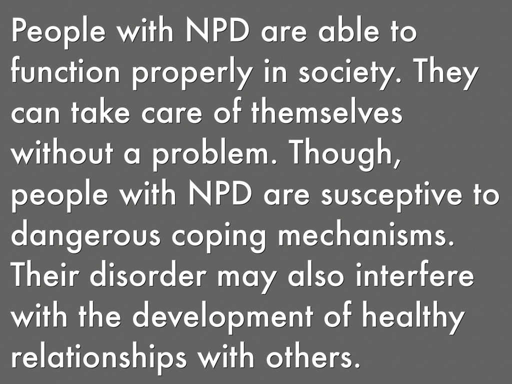 People with NPD are able to function properly in society. They can take care of themselves without a problem. Though, people with NPD are susceptive to dangerous coping mechanisms. Their disorder may also interfere with the development of healthy relationships with others.