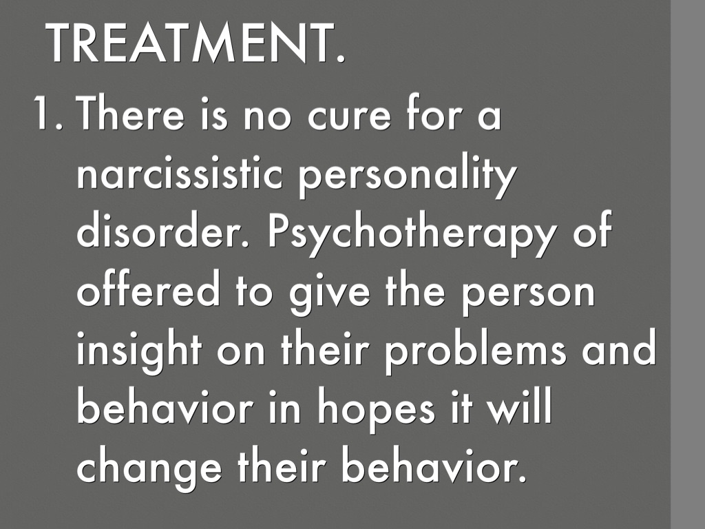 - There is no cure for a narcissistic personality disorder. Psychotherapy of offered to give the person insight on their problems and behavior in hopes it will change their behavior.