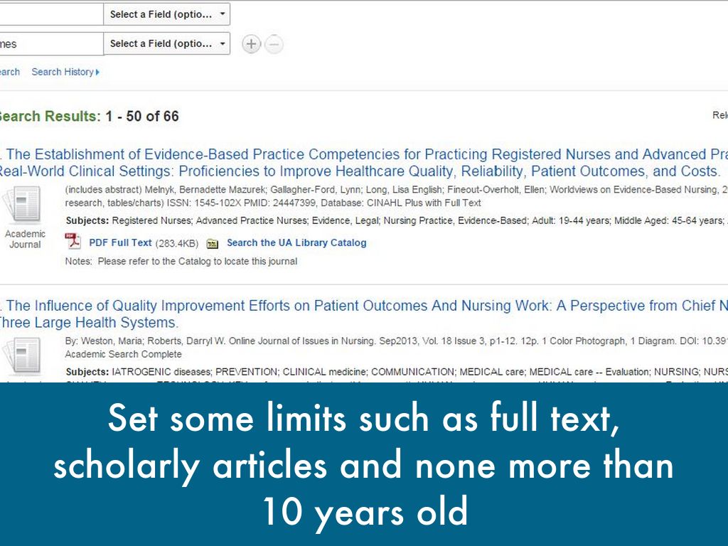 Set some limits such as full text, scholarly articles and none more than 10 years old
