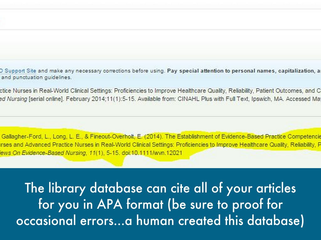 The library database can cite all of your articles for you in APA format (be sure to proof for occasional errors...a human created this database)