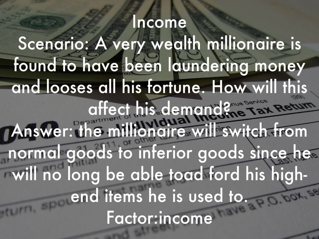 Income Scenario: A very wealth millionaire is found to have been laundering money and looses all his fortune. How will this affect his demand? Answer: the millionaire will switch from normal goods to inferior goods since he will no long be able toad ford his high-end items he is used to. Factor:income