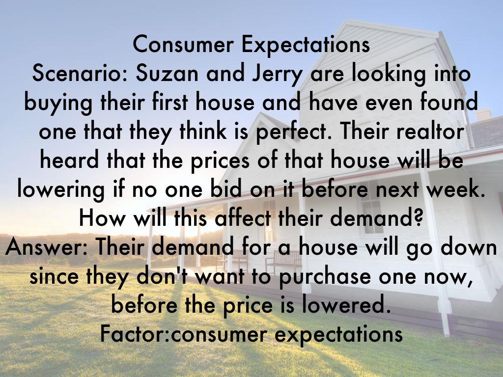 Consumer Expectations Scenario: Suzan and Jerry are looking into buying their first house and have even found one that they think is perfect. Their realtor heard that the prices of that house will be lowering if no one bid on it before next week. How will this affect their demand? Answer: Their demand for a house will go down since they don't want to purchase one now, before the price is lowered. Factor:consumer expectations