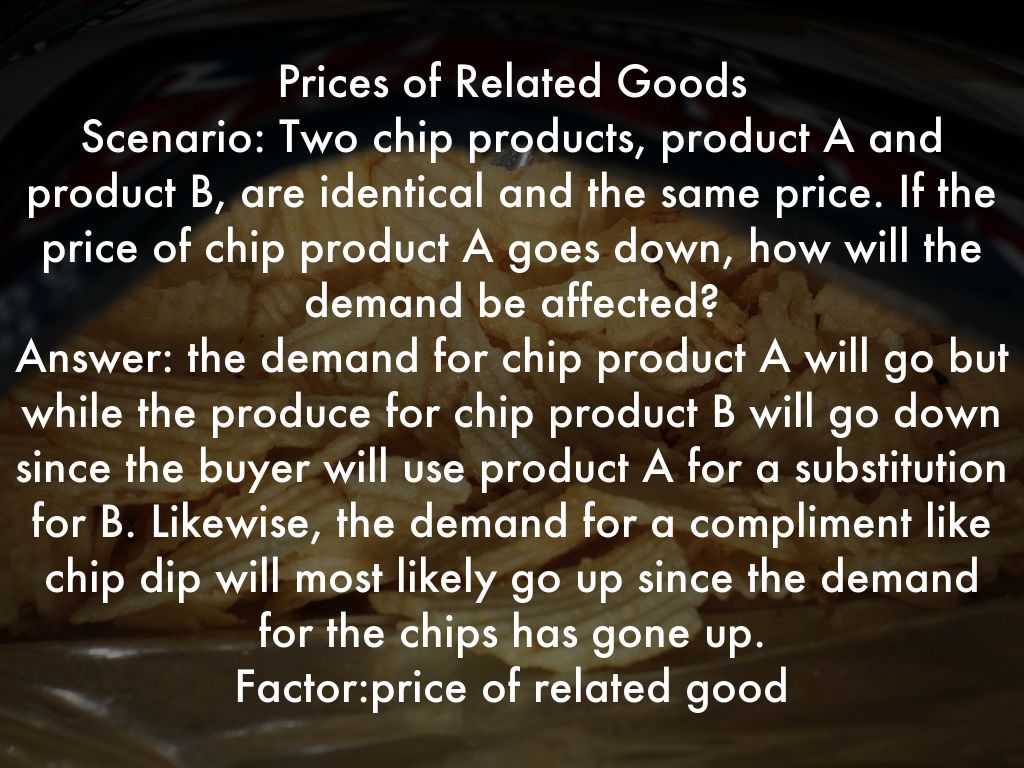 Prices of Related Goods Scenario: Two chip products, product A and product B, are identical and the same price. If the price of chip product A goes down, how will the demand be affected? Answer: the demand for chip product A will go but while the produce for chip product B will go down since the buyer will use product A for a substitution for B. Likewise, the demand for a compliment like chip dip will most likely go up since the demand for the chips has gone up. Factor:price of related good