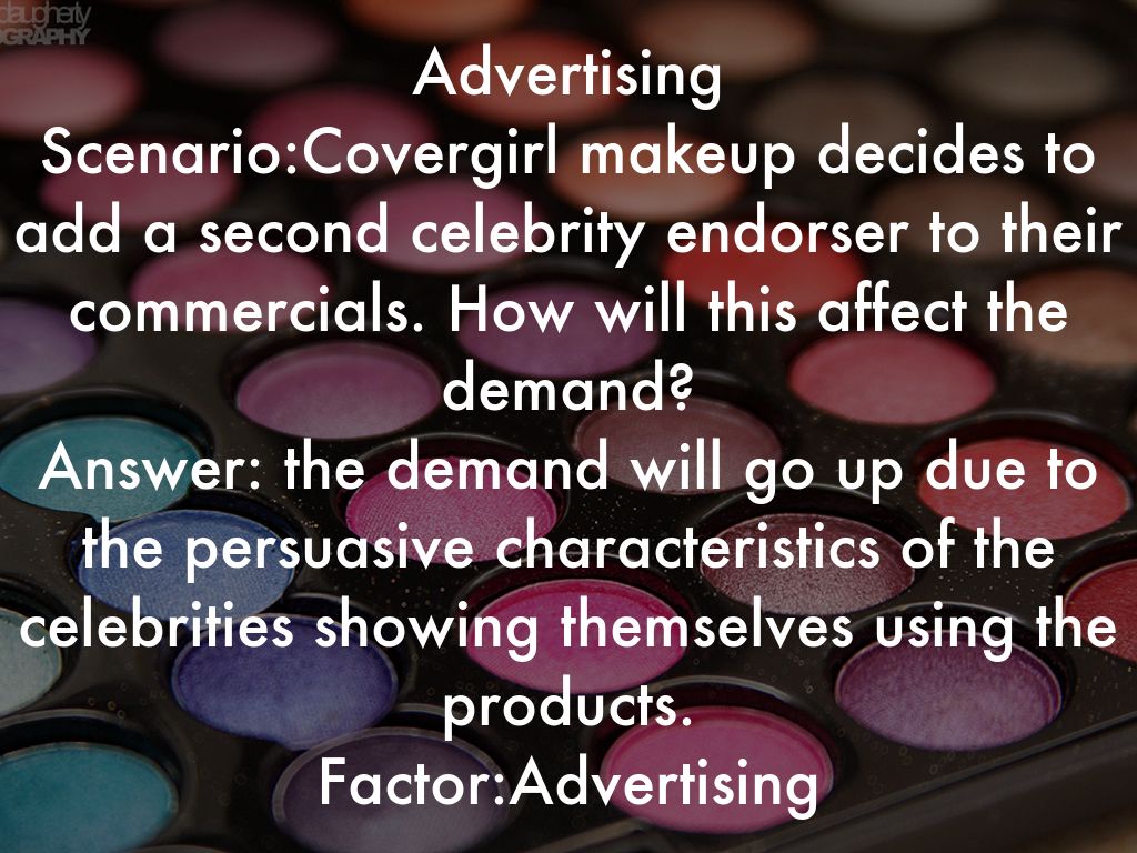 Advertising Scenario:Covergirl makeup decides to add a second celebrity endorser to their commercials. How will this affect the demand? Answer: the demand will go up due to the persuasive characteristics of the celebrities showing themselves using the products. Factor:Advertising