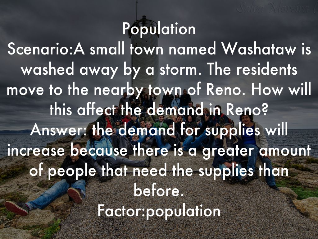 Population Scenario:A small town named Washataw is washed away by a storm. The residents move to the nearby town of Reno. How will this affect the demand in Reno? Answer: the demand for supplies will increase because there is a greater amount of people that need the supplies than before. Factor:population