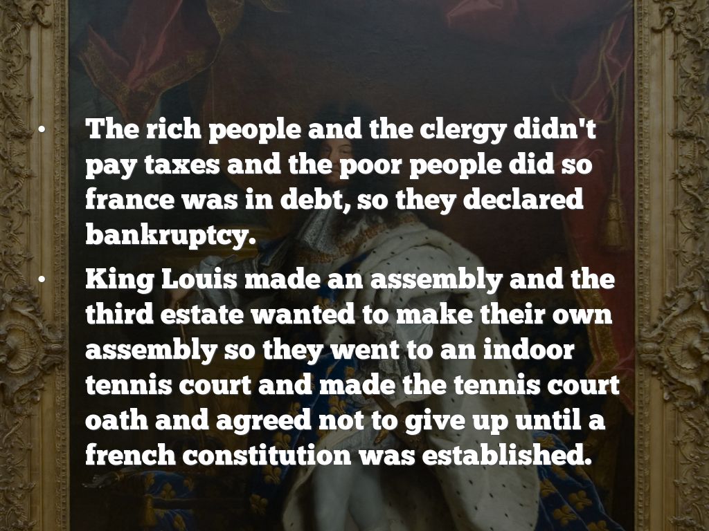 • The rich people and the clergy didn't pay taxes and the poor people did so france was in debt, so they declared bankruptcy.
