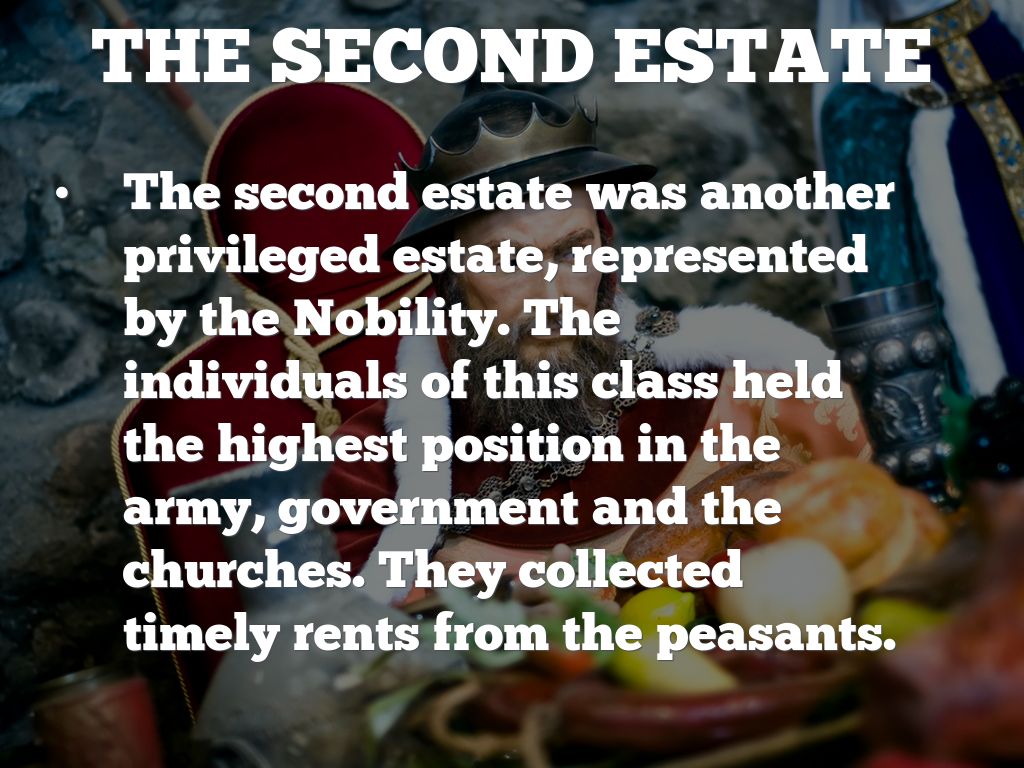 • The second estate was another privileged estate, represented by the Nobility. The individuals of this class held the highest position in the army, government and the churches. They collected timely rents from the peasants.