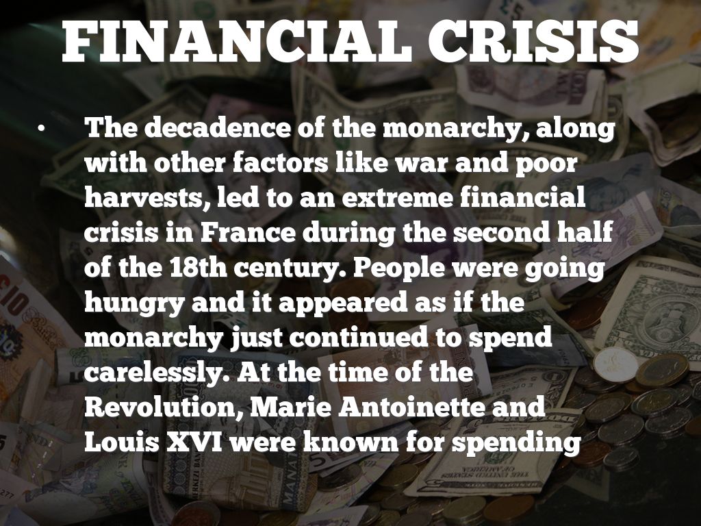 • The decadence of the monarchy, along with other factors like war and poor harvests, led to an extreme financial crisis in France during the second half of the 18th century. People were going hungry and it appeared as if the monarchy just continued to spend carelessly. At the time of the Revolution, Marie Antoinette and Louis XVI were known for spending carelessly. Marie Antoinette is frequently credited with callously saying, "Let them eat cake" in response to finding out that Parisians were starving. However, it is probably more accurate to say that she was in fact totally unaware of the people's suffering. Louis XVI further added fuel to the fire by dismissing financial ministers who tried to bring about reform.