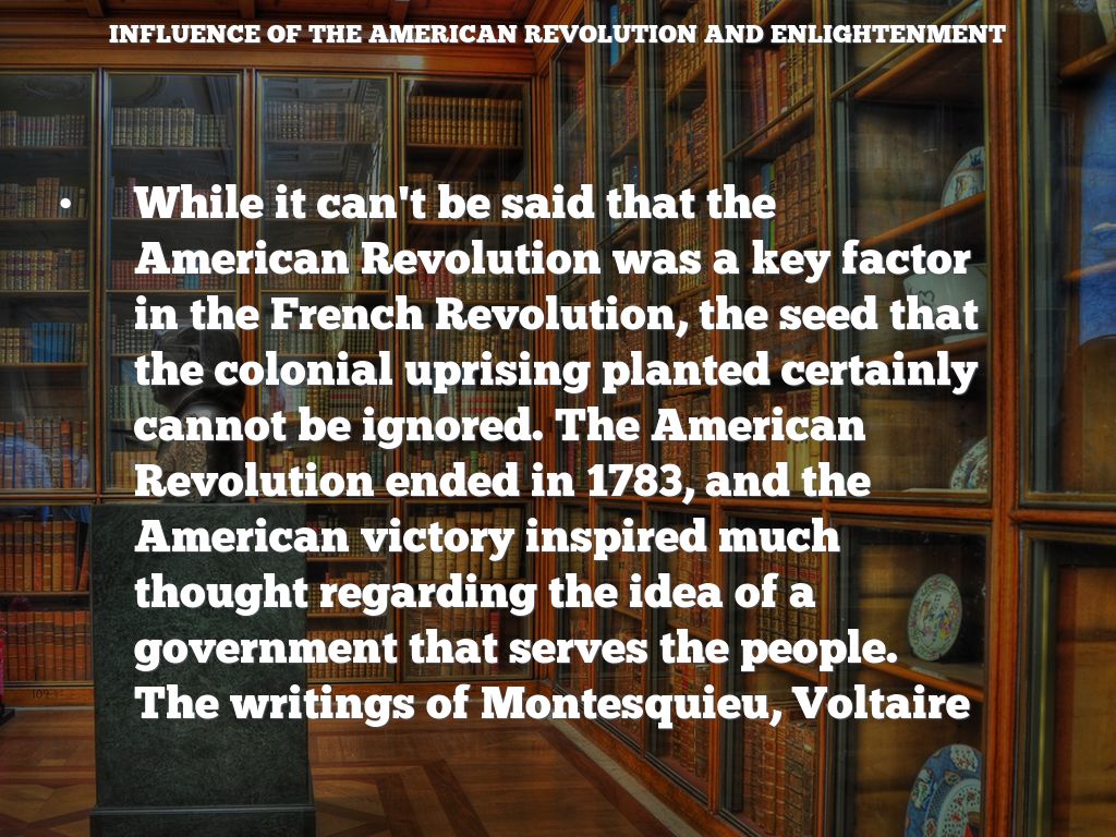 • While it can't be said that the American Revolution was a key factor in the French Revolution, the seed that the colonial uprising planted certainly cannot be ignored. The American Revolution ended in 1783, and the American victory inspired much thought regarding the idea of a government that serves the people. The writings of Montesquieu, Voltaire and Rousseau were highly influential as they circulated throughout society, accessible to the common man. Social Inequalities