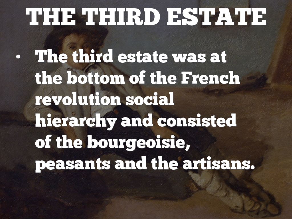 • The third estate was at the bottom of the French revolution social hierarchy and consisted of the bourgeoisie, peasants and the artisans.