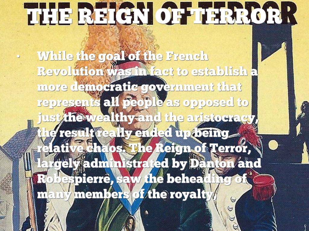 • While the goal of the French Revolution was in fact to establish a more democratic government that represents all people as opposed to just the wealthy and the aristocracy, the result really ended up being relative chaos. The Reign of Terror, largely administrated by Danton and Robespierre, saw the beheading of many members of the royalty, including Marie Antoinette and countless others who were members of the French court or in some way considered a threat to the new government.