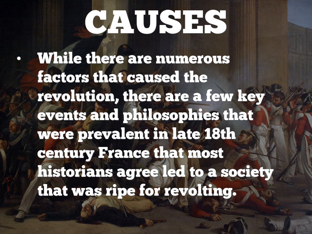 • While there are numerous factors that caused the revolution, there are a few key events and philosophies that were prevalent in late 18th century France that most historians agree led to a society that was ripe for revolting.