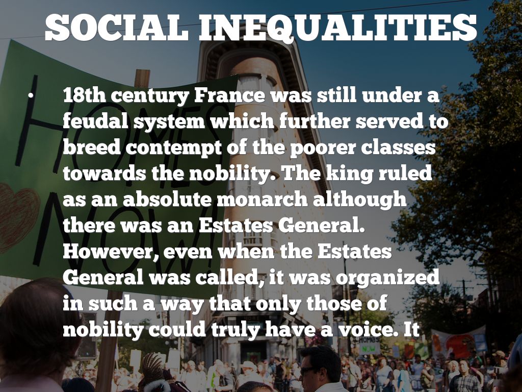 • 18th century France was still under a feudal system which further served to breed contempt of the poorer classes towards the nobility. The king ruled as an absolute monarch although there was an Estates General. However, even when the Estates General was called, it was organized in such a way that only those of nobility could truly have a voice. It was in this manner that the people were shut out. It was in this climate that the seeds of revolution were planted and watered.