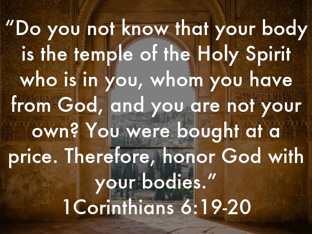 “Do you not know that your body is the temple of the Holy Spirit who is in you, whom you have from God, and you are not your own? You were bought at a price. Therefore, honor God with your bodies.” 1Corinthians 6:19-20