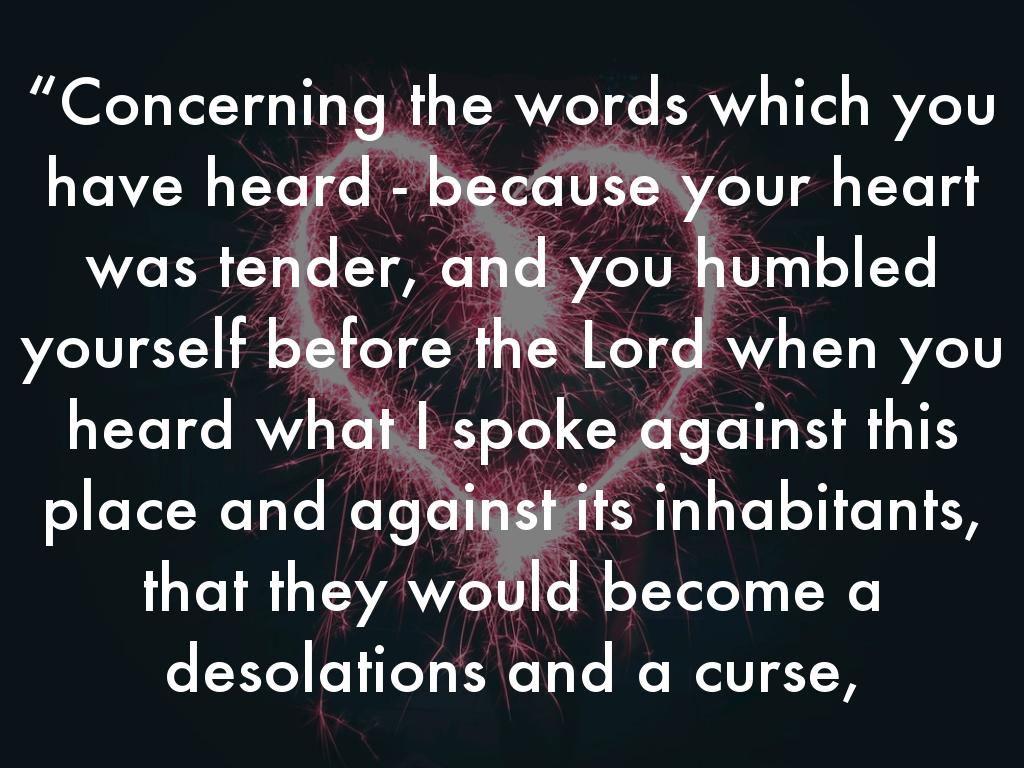 “Concerning the words which you have heard - because your heart was tender, and you humbled yourself before the Lord when you heard what I spoke against this place and against its inhabitants, that they would become a desolations and a curse,