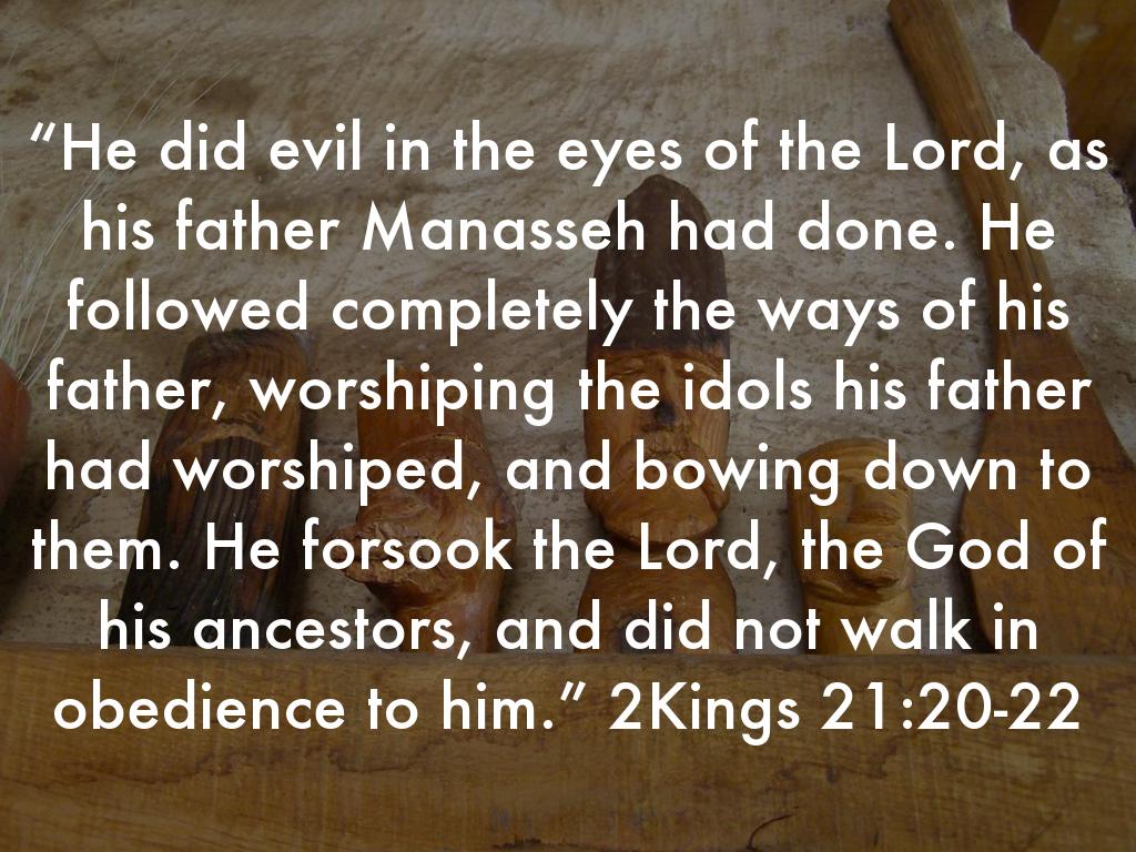 “He did evil in the eyes of the Lord, as his father Manasseh had done. He followed completely the ways of his father, worshiping the idols his father had worshiped, and bowing down to them. He forsook the Lord, the God of his ancestors, and did not walk in obedience to him.” 2Kings 21:20-22
