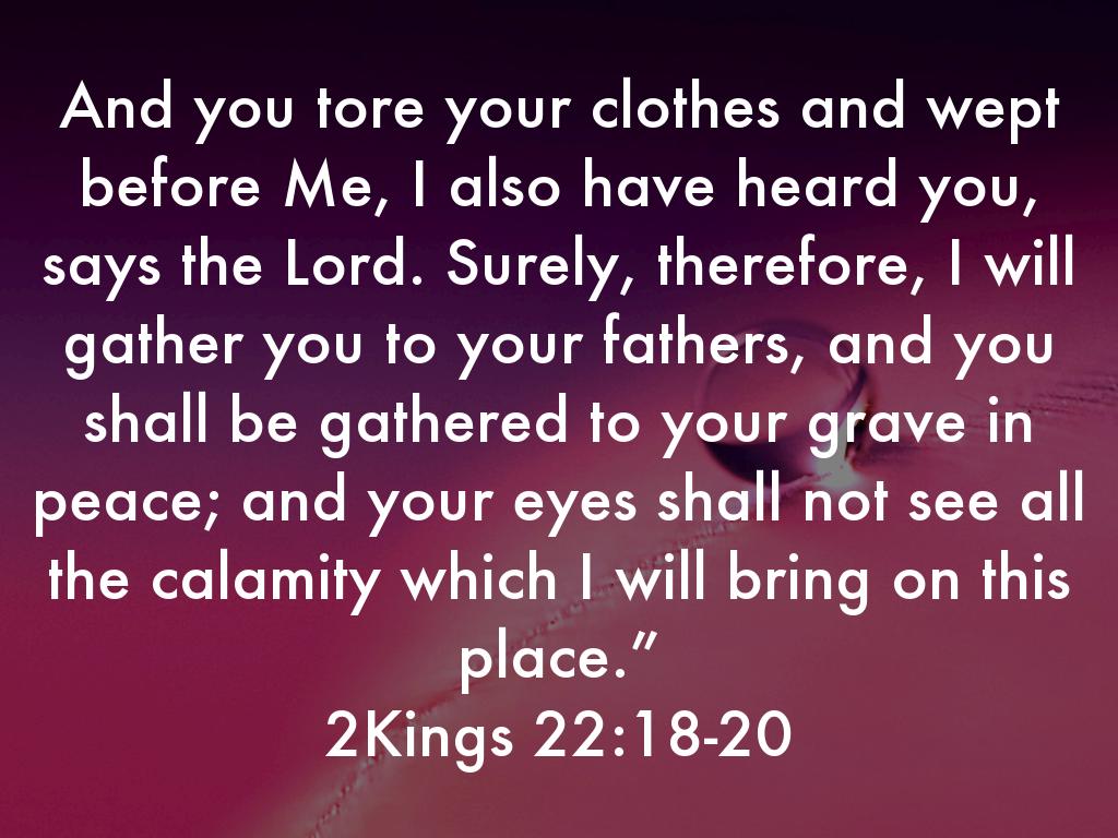 And you tore your clothes and wept before Me, I also have heard you, says the Lord. Surely, therefore, I will gather you to your fathers, and you shall be gathered to your grave in peace; and your eyes shall not see all the calamity which I will bring on this place.” 2Kings 22:18-20