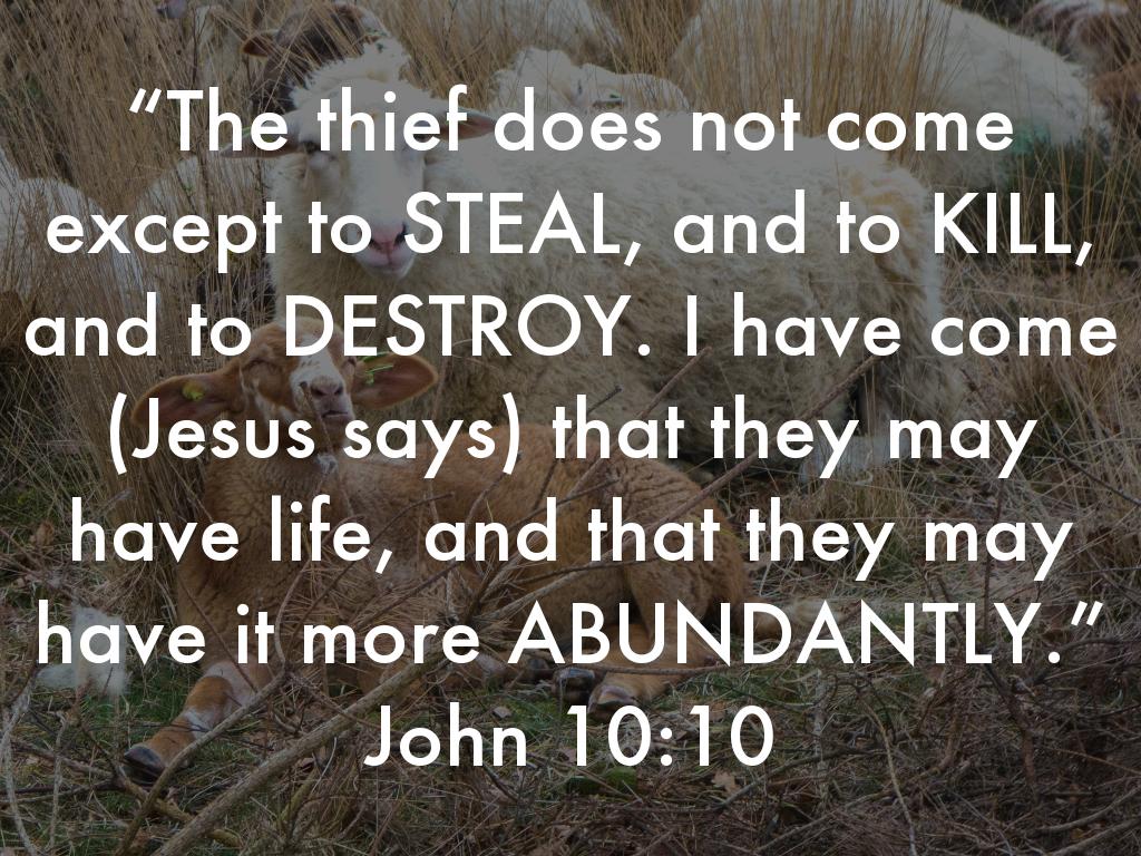 “The thief does not come except to STEAL, and to KILL, and to DESTROY. I have come (Jesus says) that they may have life, and that they may have it more ABUNDANTLY.” John 10:10