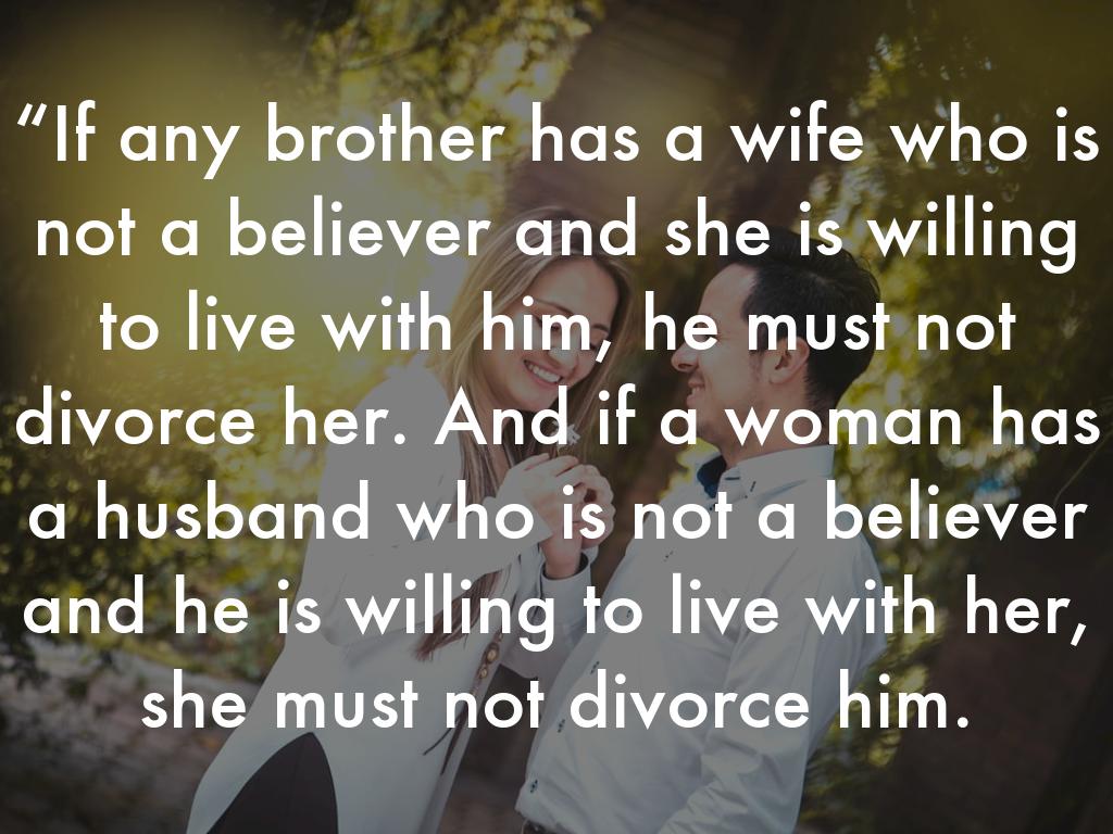 “If any brother has a wife who is not a believer and she is willing to live with him, he must not divorce her. And if a woman has a husband who is not a believer and he is willing to live with her, she must not divorce him.