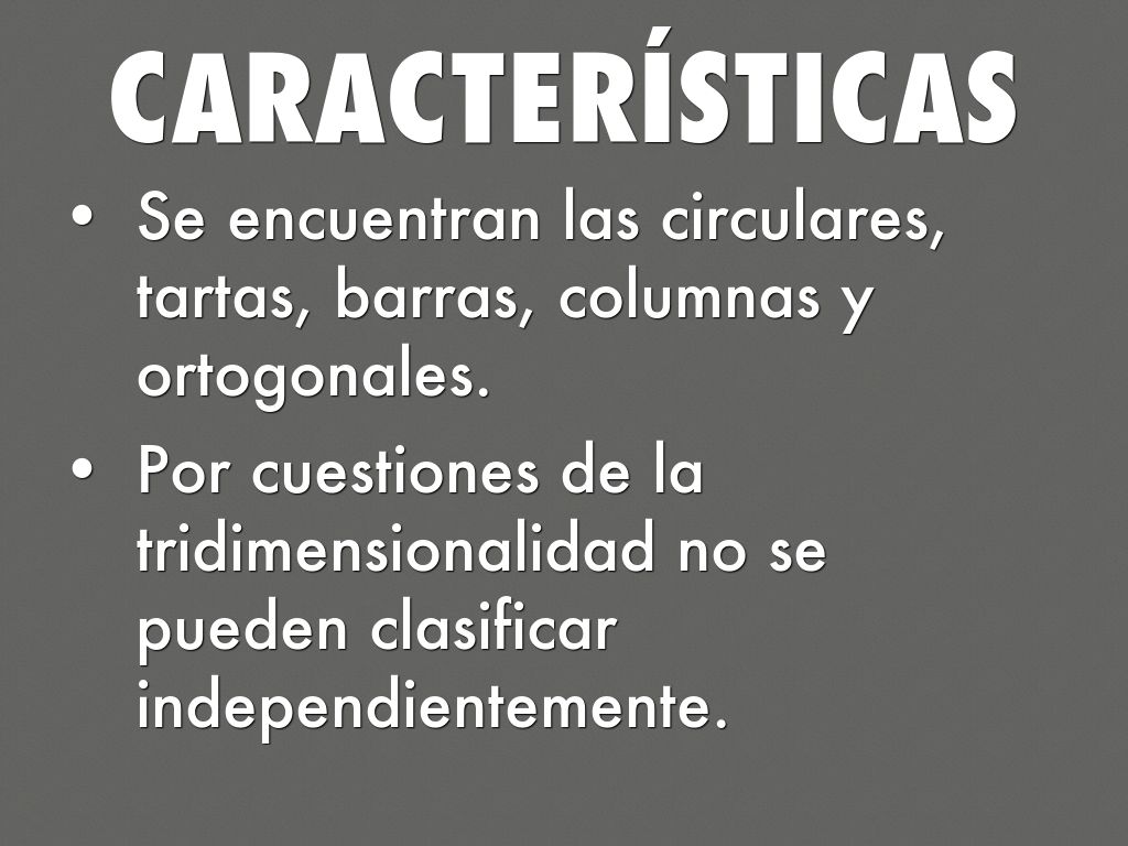 Se encuentran las circulares, tartas, barras, columnas y ortogonales.