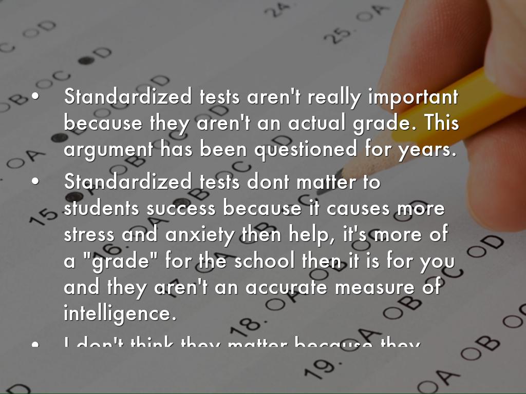 • Standardized tests dont matter to students success because it causes more stress and anxiety then help, it's more of a "grade" for the school then it is for you and they aren't an accurate measure of intelligence.