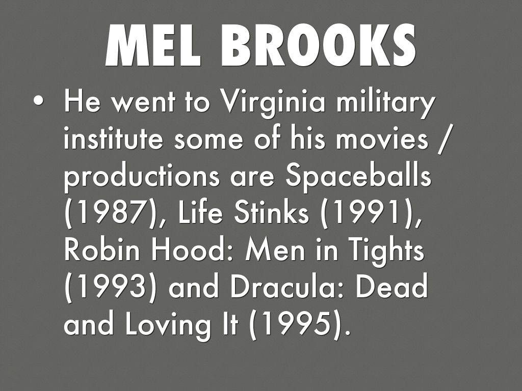 He went to Virginia military institute some of his movies / productions are Spaceballs (1987), Life Stinks (1991), Robin Hood: Men in Tights (1993) and Dracula: Dead and Loving It (1995).
