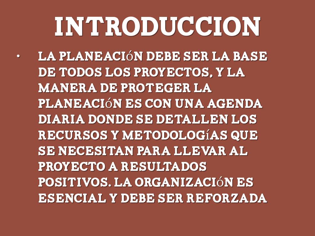 - La planeación debe ser la base de todos los proyectos, y la manera de proteger la planeación es con una agenda diaria donde se detallen los recursos y metodologías que se necesitan para llevar al proyecto a resultados positivos. La organización es esencial y debe ser reforzada por cada uno de los integrantes del equipo.
