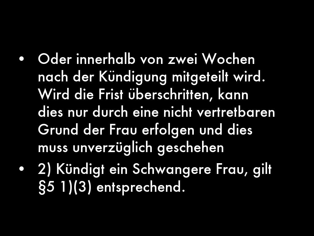 Oder innerhalb von zwei Wochen nach der Kündigung mitgeteilt wird. Wird die Frist überschritten, kann dies nur durch eine nicht vertretbaren Grund der Frau erfolgen und dies muss unverzüglich geschehen