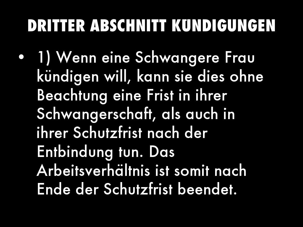 1) Wenn eine Schwangere Frau kündigen will, kann sie dies ohne Beachtung eine Frist in ihrer Schwangerschaft, als auch in ihrer Schutzfrist nach der Entbindung tun. Das Arbeitsverhältnis ist somit nach Ende der Schutzfrist beendet.