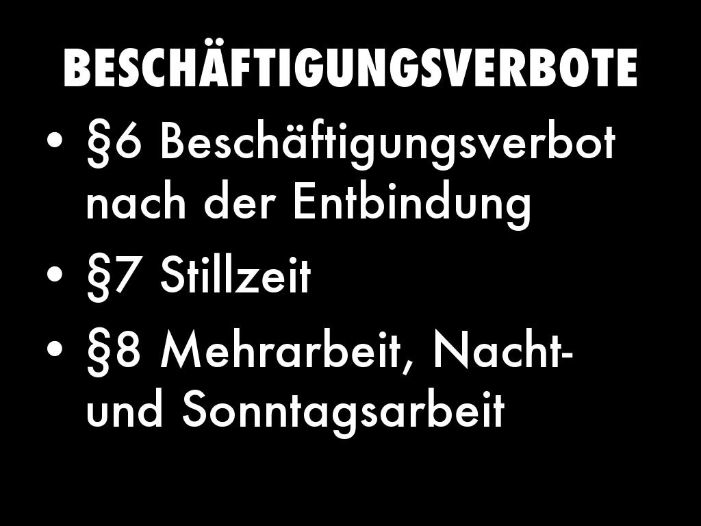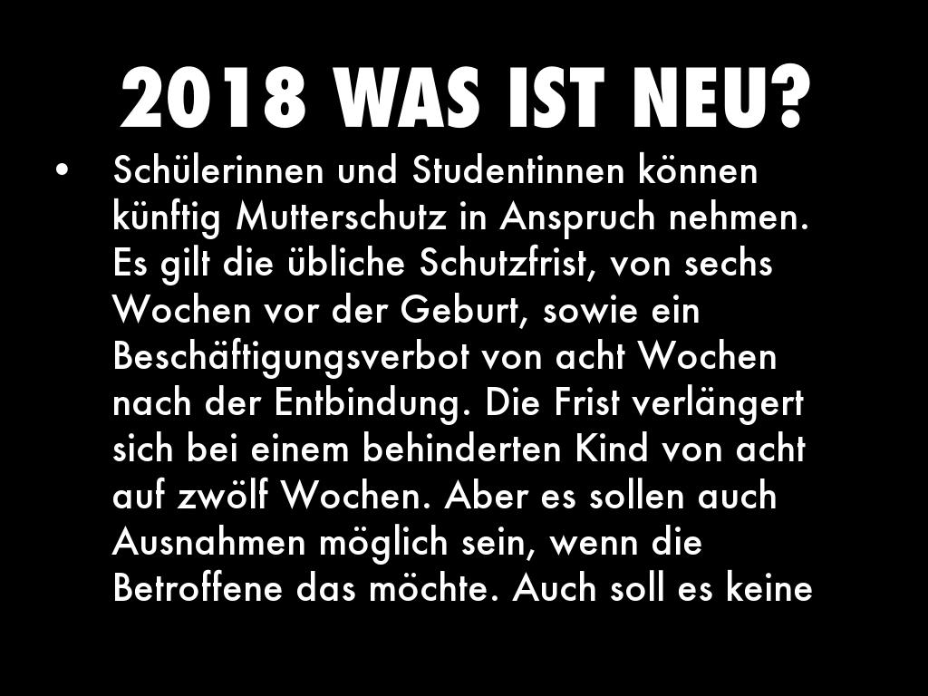 Schülerinnen und Studentinnen können künftig Mutterschutz in Anspruch nehmen. Es gilt die übliche Schutzfrist, von sechs Wochen vor der Geburt, sowie ein Beschäftigungsverbot von acht Wochen nach der Entbindung. Die Frist verlängert sich bei einem behinderten Kind von acht auf zwölf Wochen. Aber es sollen auch Ausnahmen möglich sein, wenn die Betroffene das möchte. Auch soll es keine Arbeitsverbote gegen den Willen der Schwangeren geben.