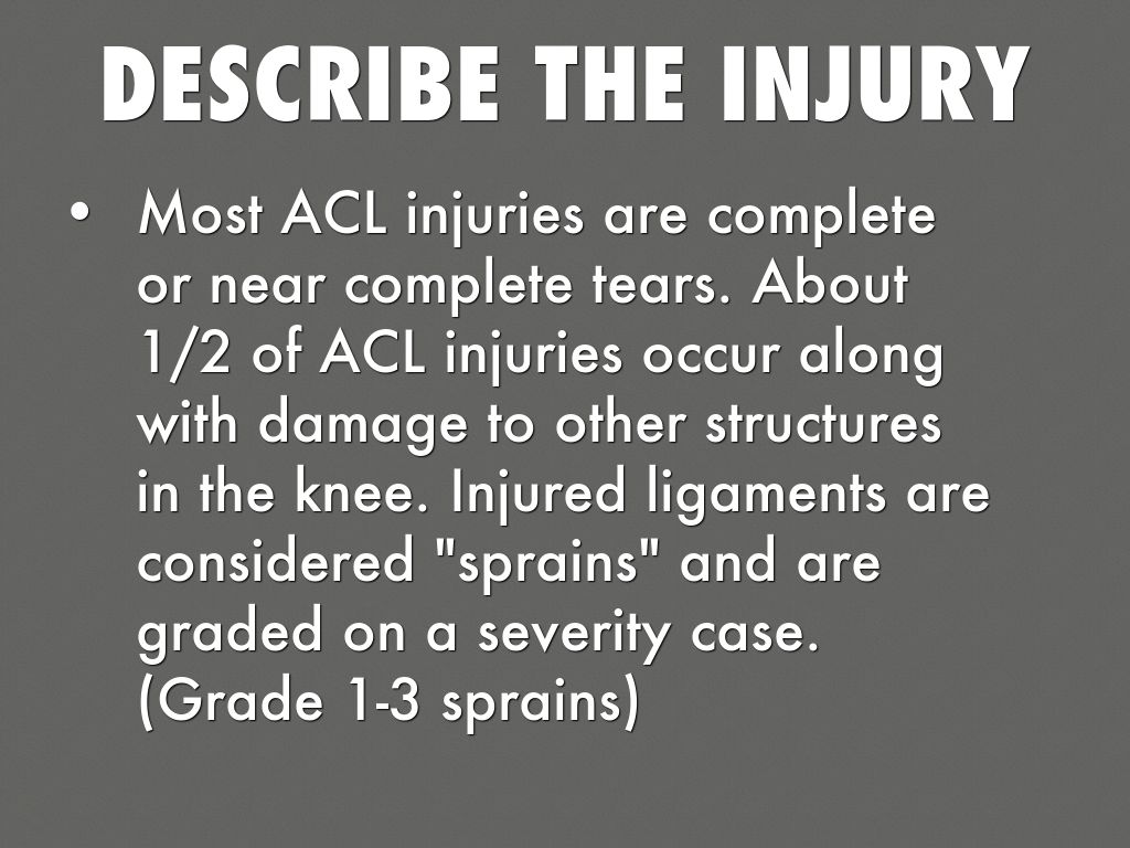 Most ACL injuries are complete or near complete tears. About 1/2 of ACL injuries occur along with damage to other structures in the knee. Injured ligaments are considered "sprains" and are graded on a severity case. (Grade 1-3 sprains)