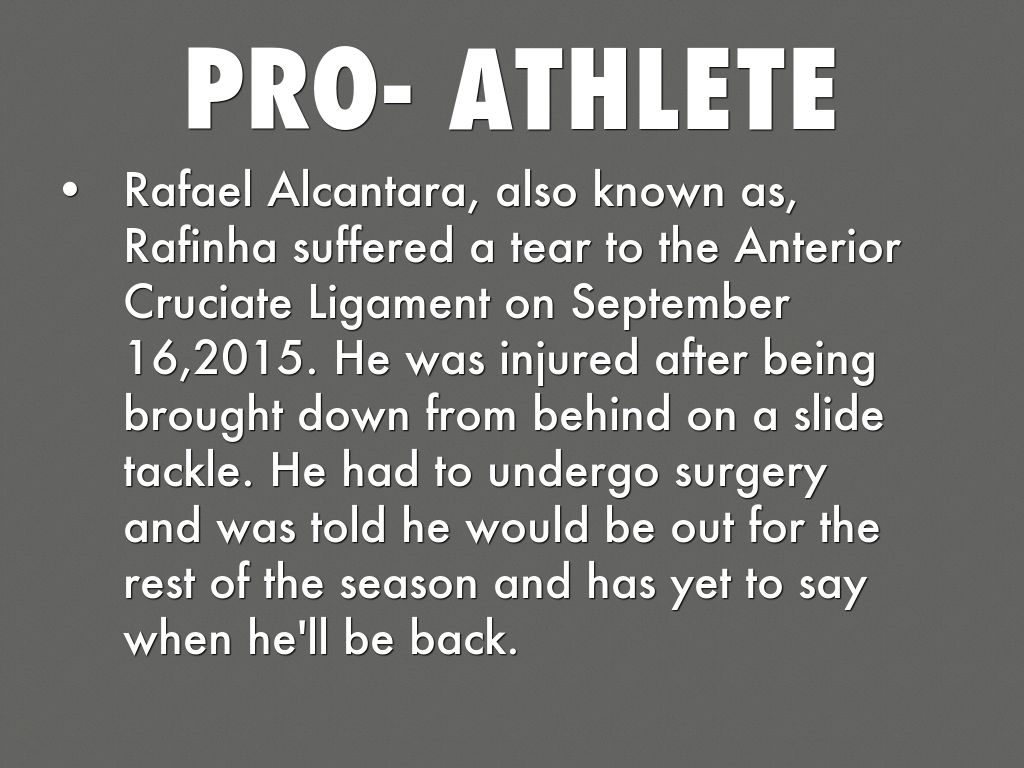 Rafael Alcantara, also known as, Rafinha suffered a tear to the Anterior Cruciate Ligament on September 16,2015. He was injured after being brought down from behind on a slide tackle. He had to undergo surgery and was told he would be out for the rest of the season and has yet to say when he'll be back.
