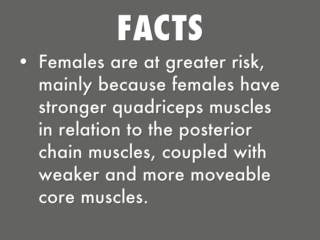 Females are at greater risk, mainly because females have stronger quadriceps muscles in relation to the posterior chain muscles, coupled with weaker and more moveable core muscles.