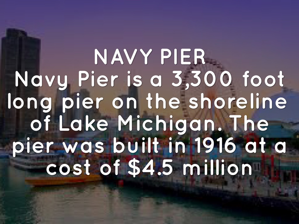 Navy Pier is a 3,300 foot long pier on the shoreline of Lake Michigan. The pier was built in 1916 at a cost of $4.5 million
