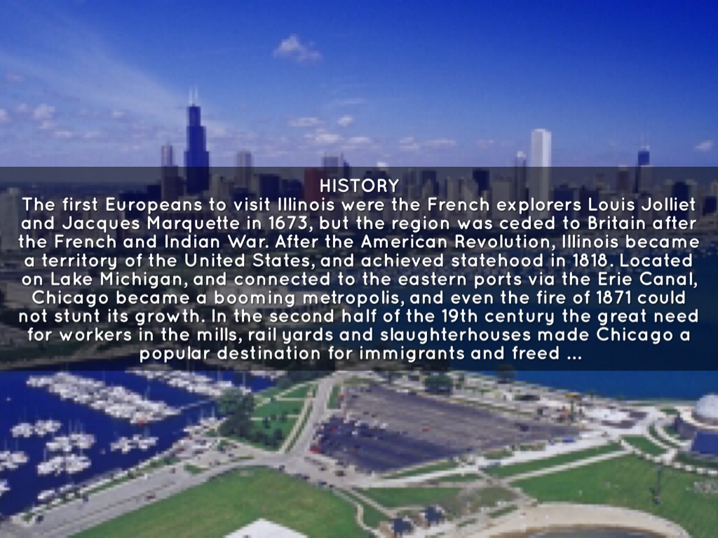 The first Europeans to visit Illinois were the French explorers Louis Jolliet and Jacques Marquette in 1673, but the region was ceded to Britain after the French and Indian War. After the American Revolution, Illinois became a territory of the United States, and achieved statehood in 1818. Located on Lake Michigan, and connected to the eastern ports via the Erie Canal, Chicago became a booming metropolis, and even the fire of 1871 could not stunt its growth. In the second half of the 19th century the great need for workers in the mills, rail yards and slaughterhouses made Chicago a popular destination for immigrants and freed …