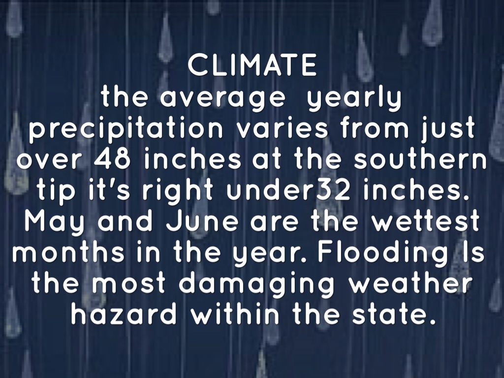 the average yearly precipitation varies from just over 48 inches at the southern tip it's right under32 inches. May and June are the wettest months in the year. Flooding Is the most damaging weather hazard within the state.