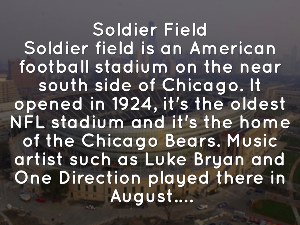 Soldier field is an American football stadium on the near south side of Chicago. It opened in 1924, it's the oldest NFL stadium and it's the home of the Chicago Bears. Music artist such as Luke Bryan and One Direction played there in August.