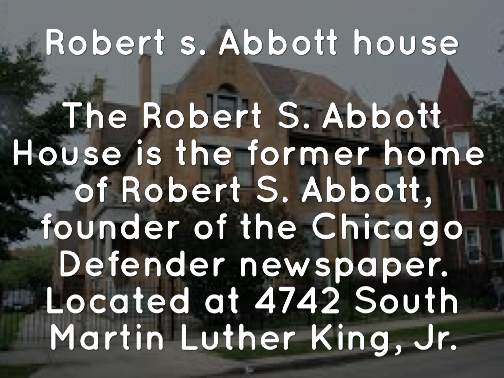 The Robert S. Abbott House is the former home of Robert S. Abbott, founder of the Chicago Defender newspaper. Located at 4742 South Martin Luther King, Jr.