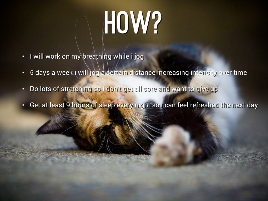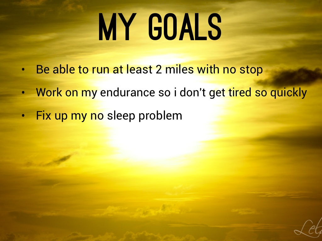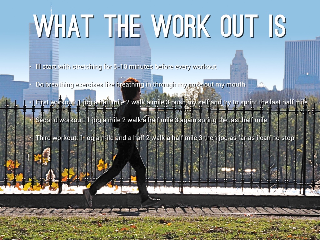 First workout: 1 jog a half mile 2 walk a mile 3 push my self and try to sprint the last half mile