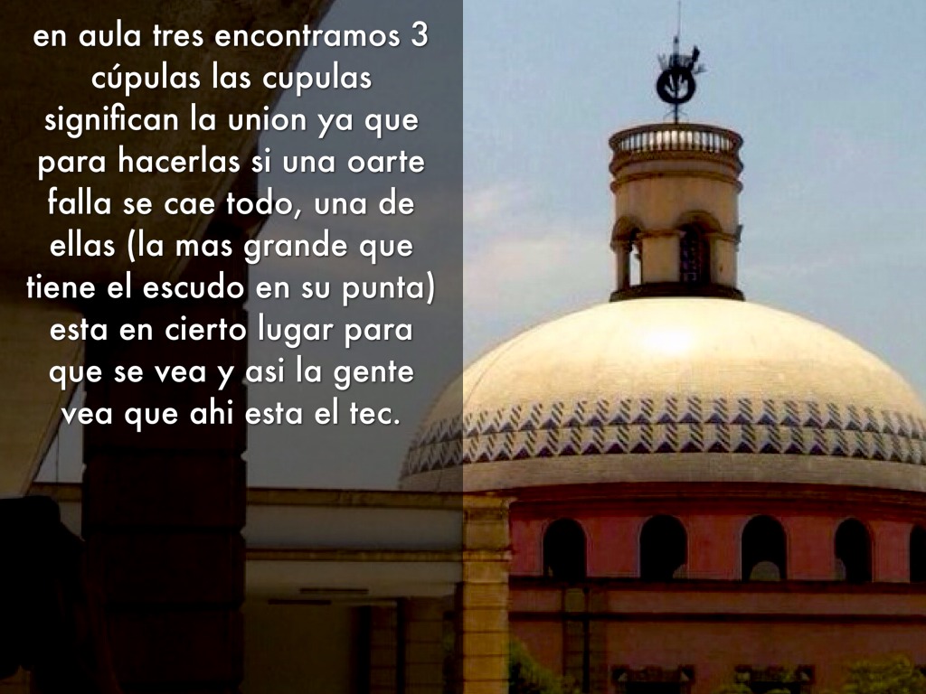 en aula tres encontramos 3 cúpulas las cupulas significan la union ya que para hacerlas si una oarte falla se cae todo, una de ellas (la mas grande que tiene el escudo en su punta) esta en cierto lugar para que se vea y asi la gente vea que ahi esta el tec.