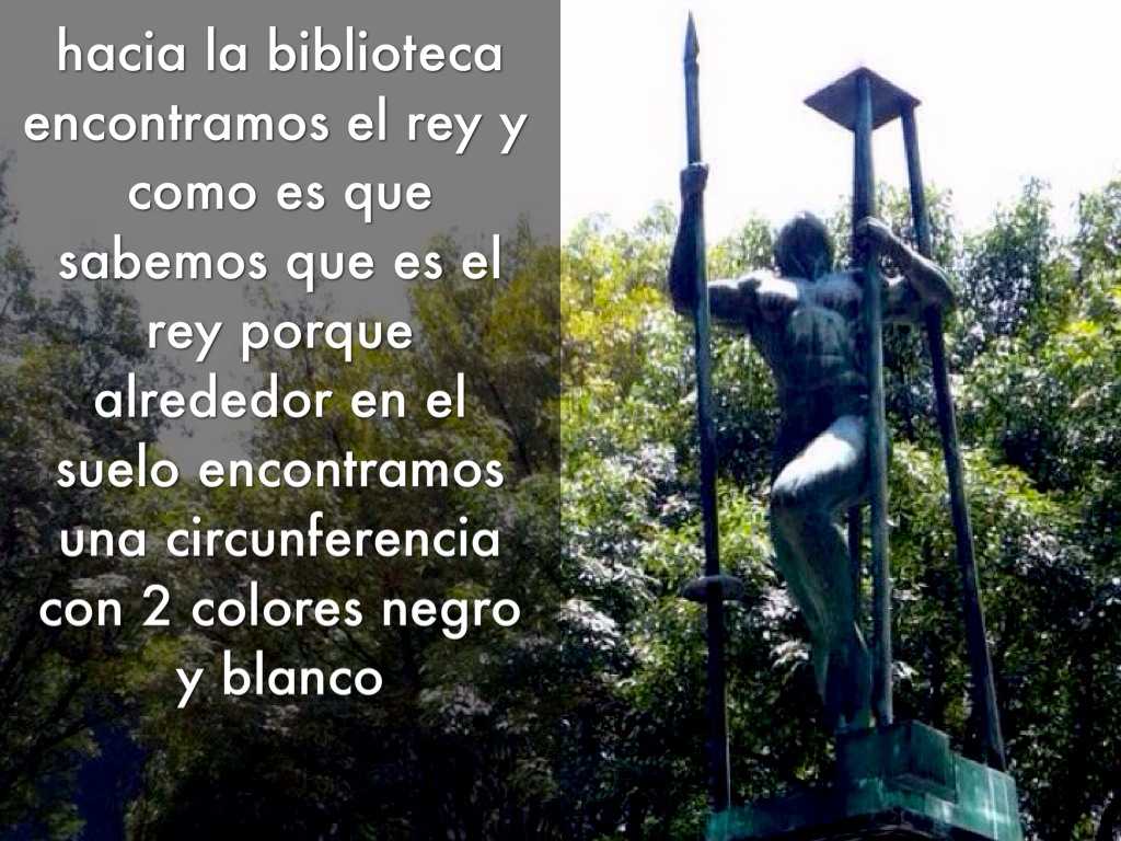 hacia la biblioteca encontramos el rey y como es que sabemos que es el rey porque alrededor en el suelo encontramos una circunferencia con 2 colores negro y blanco