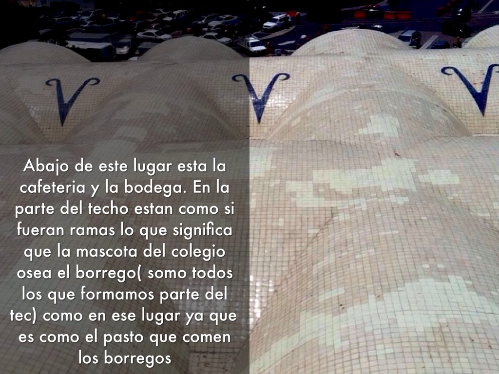 Abajo de este lugar esta la cafeteria y la bodega. En la parte del techo estan como si fueran ramas lo que significa que la mascota del colegio osea el borrego( somo todos los que formamos parte del tec) como en ese lugar ya que es como el pasto que comen los borregos