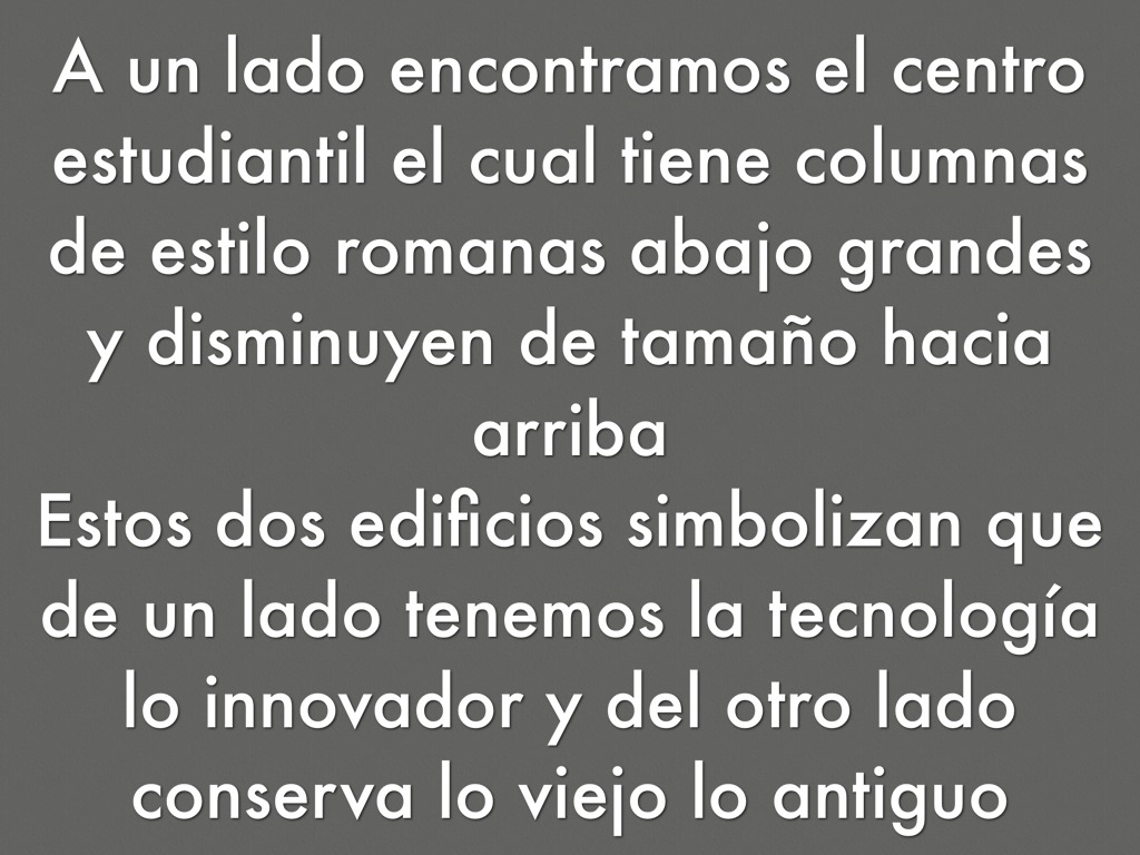 A un lado encontramos el centro estudiantil el cual tiene columnas de estilo romanas abajo grandes y disminuyen de tamaño hacia arriba