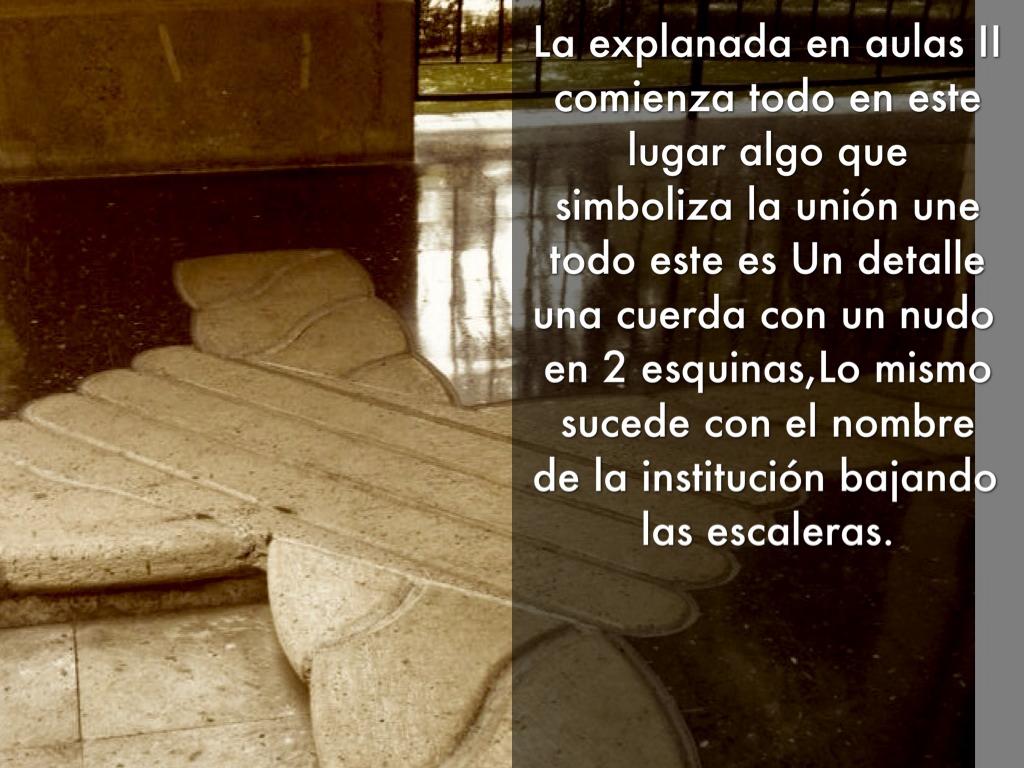 La explanada en aulas II comienza todo en este lugar algo que simboliza la unión une todo este es Un detalle una cuerda con un nudo en 2 esquinas,Lo mismo sucede con el nombre de la institución bajando las escaleras.