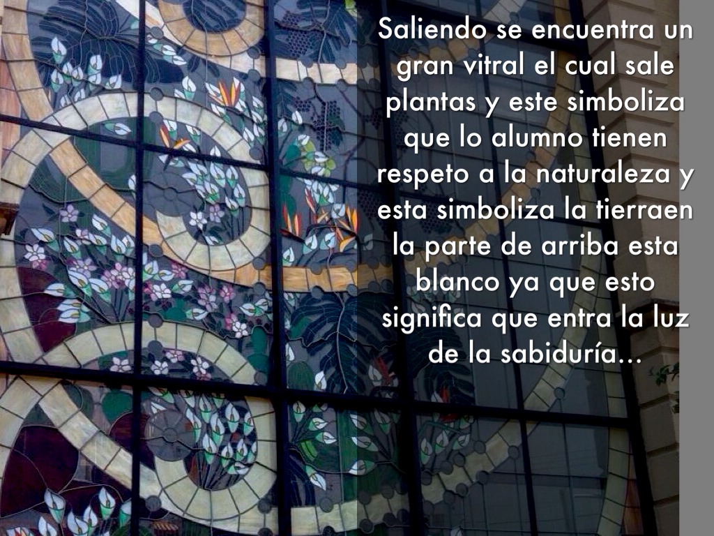 Saliendo se encuentra un gran vitral el cual sale plantas y este simboliza que lo alumno tienen respeto a la naturaleza y esta simboliza la tierraen la parte de arriba esta blanco ya que esto significa que entra la luz de la sabiduría
