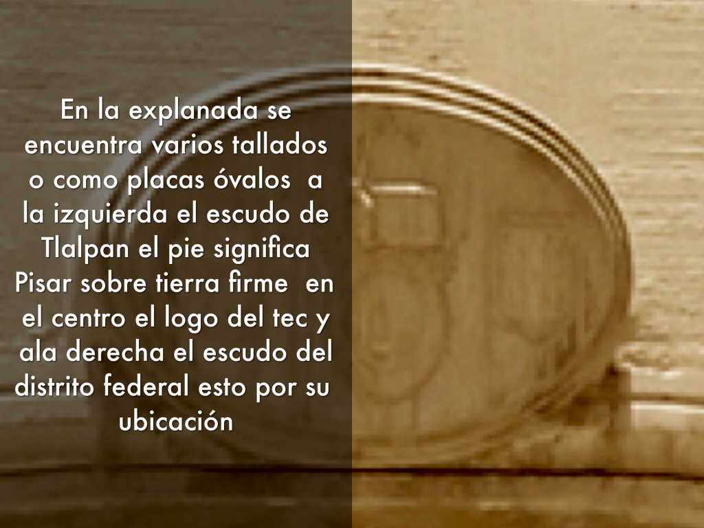 En la explanada se encuentra varios tallados o como placas óvalos a la izquierda el escudo de Tlalpan el pie significa Pisar sobre tierra firme en el centro el logo del tec y ala derecha el escudo del distrito federal esto por su ubicación