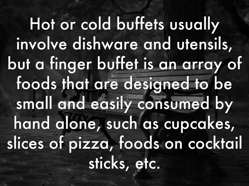 Hot or cold buffets usually involve dishware and utensils, but a finger buffet is an array of foods that are designed to be small and easily consumed by hand alone, such as cupcakes, slices of pizza, foods on cocktail sticks, etc.