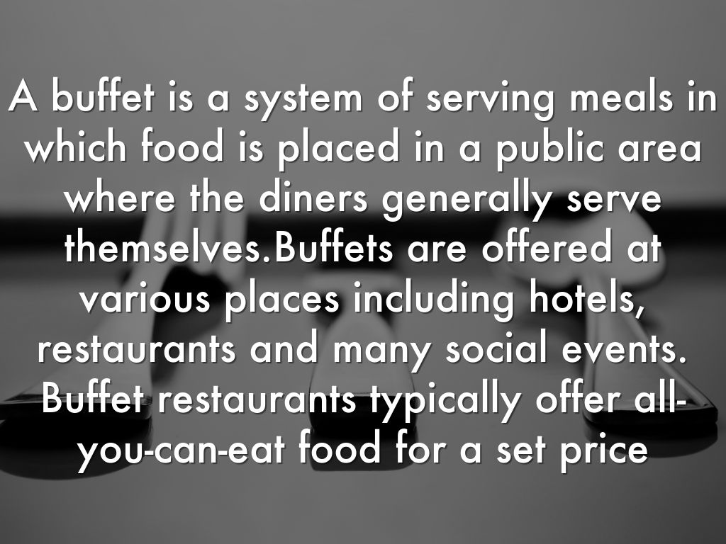 A buffet is a system of serving meals in which food is placed in a public area where the diners generally serve themselves.Buffets are offered at various places including hotels, restaurants and many social events. Buffet restaurants typically offer all-you-can-eat food for a set price